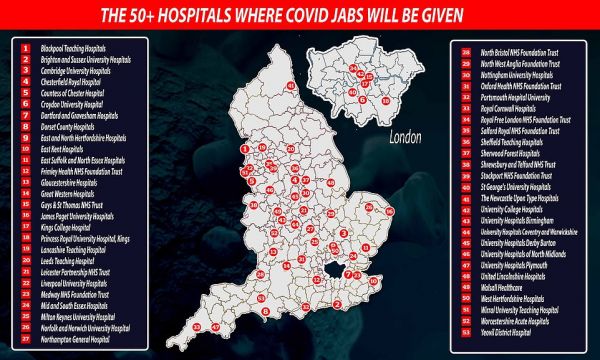 Όπως αναφέρεται χαρακτηριστικά, τα 13 νοσοκομεία που θα παραλάβουν τις δόσεις βρίσκονται στην κεντρική Αγγλία, 8 στα βορειοδυτικά, νοτιοανατολικά και νοτιοδυτικά, ενώ επτά είναι στην ανατολική Αγγλία και το Λονδίνο. Αντίθετα, και μόνο ένα νοσοκομείο θα διαθέτει τις δόσεις στο Γιορκσάιρ στα βορειοανατολικά της χώρας.