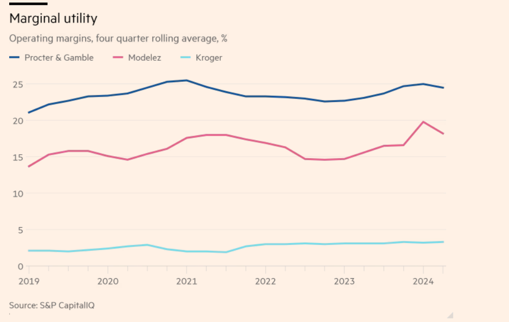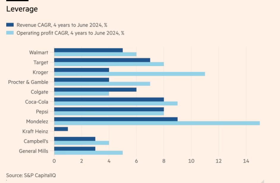 Κοιτάζοντας περαιτέρω, οι μεγάλοι προμηθευτές γνώρισαν επίσης αναπτυξιακή άνθηση, σε επίπεδα Covid, όταν το φαγητό αφθονούσε στα σπίτια. Το εύρος ανάπτυξης κυμαίνεται μεταξύ μιας επιπλέον ποσοστιαίας μονάδας ετησίως (Kroger) έως σχεδόν 10 (Mondelez), αναφέρουν οι FT.