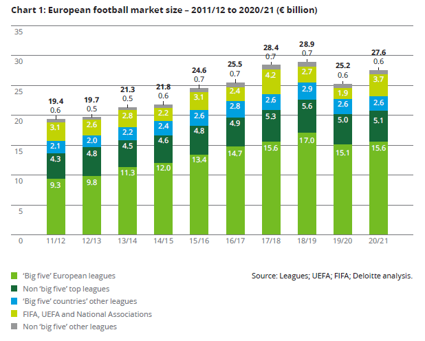 Σύμφωνα με τα ευρήματα του 31ου Annual Review of Football Finance του Sports Business Group της Deloitte, η ευρωπαϊκή αγορά ποδοσφαίρου συνολικά σημείωσε αύξηση εσόδων κατά 10% αγγίζοντας τα €27,6 δισ. κατά την περίοδο 2020-2021, παρά την απουσία των φιλάθλων από τα ποδοσφαιρικά γήπεδα κατά τη διάρκεια της σεζόν.