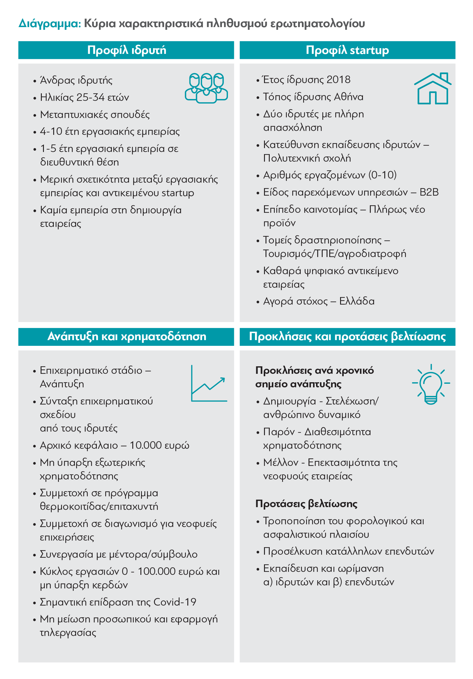 Μεταξύ των ιδρυτών startups που απάντησαν στην έρευνα, η μεγάλη πλειοψηφία -8 στους 10- είναι άνδρες, μια ανισότητα που παρατηρείται και στις υπόλοιπες ευρωπαϊκές χώρες, οι οποίες έχουν, κατά μέσο όρο, αντίστοιχη κατανομή μεταξύ των φύλων. Από τη σκοπιά της ηλικίας, οι ιδρυτές των startups είναι σχετικά νέοι: 9 στους 10 είναι νεότεροι από 44 ετών, ενώ περισσότεροι από το 50% είναι νεότεροι από 34 ετών. Είναι επίσης συνήθως αρκετά μορφωμένοι: 48,7% έχουν μεταπτυχιακό και 17,2% διδακτορικό. Οι περισσότεροι δηλώνουν σπουδές είτε σε σχολή Πολυτεχνείου είτε σε σχολή διοίκησης επιχειρήσεων. Το 68,2% έχει σαν πλήρη απασχόληση τη startup του.