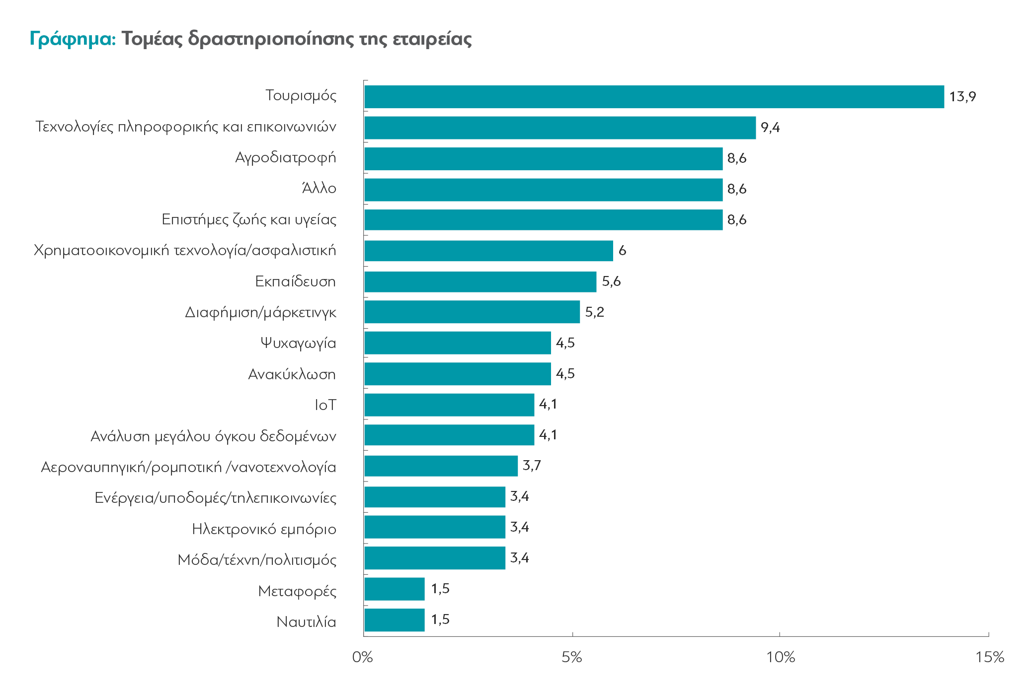 Σε ποιους τομείς δραστηριοποιούνται οι startups; Ο τομέας στον οποίο δραστηριοποιούνται οι περισσότερες είναι ο τουρισμός. Όπως είναι μάλλον αναμενόμενο, μεγάλο ποσοστό αυτών των εταιρειών, σχεδόν 1 στις 10, δραστηριοποιείται στην πληροφορική και τις επικοινωνίες (ΤΠΕ), ενώ αντίστίστοιχο είναι και το ποσοστό που ασχολείται με την αγροδιατροφή και με τις επιστήμες ζωής και υγείας (8,6%). Είναι αρκετά ενδιαφέρον το ότι η σειρά των τομέων για τις startups του εξωτερικού είναι λίγο διαφορετική: προηγούνται οι ΤΠΕ και έπονται ο τουρισμός και η αγροδιατροφή.