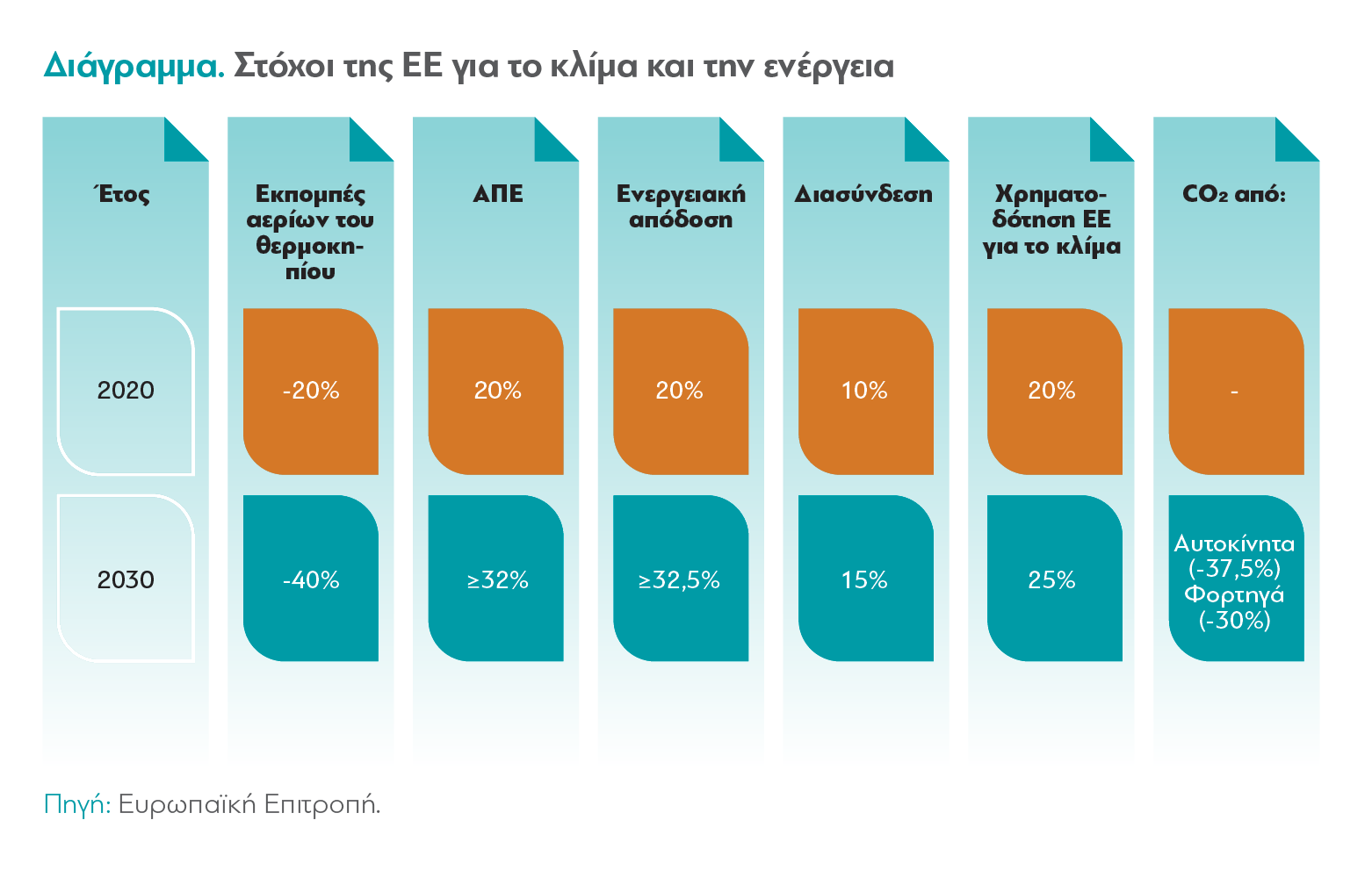 Οι αρχικοί ποσοτικοί στόχοι πολιτικής της ΕΕ για την Ενέργεια και το Κλίμα (γνωστοί και ως στόχοι “20-20-20”), οι οποίοι νομοθετήθηκαν το 2009, είχαν χρονικό ορίζοντα μέχρι το 2020 και περιελάμβαναν: