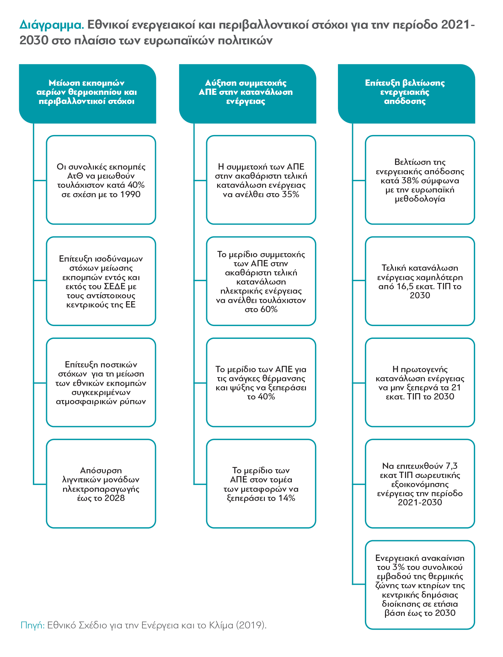 Το Εθνικό Σχέδιο για την Ενέργεια και το Κλίμα (ΕΣΕΚ), το οποίο δημοσιεύτηκε τον Δεκέμβριο του 2019, ενσωματώνει τις βασικές κατευθύνσεις της πολιτικής της ΕΕ και αποτελεί το βασικό εργαλείο ενεργειακής πολιτικής της χώρας για την επίτευξη ποιοτικών και ποσοτικών στόχων την περίοδο 2021-2030. Το ΕΣΕΚ περιλαμβάνει συγκεκριμένα μέτρα πολιτικής, τα οποία λαμβάνουν υπόψη το δυναμικό, τις τεχνικές ιδιαιτερότητες και τα ποιοτικά χαρακτηριστικά του ελληνικού ενεργειακού συστήματος στους τομείς της παραγωγής, διάθεσης και κατανάλωσης ενέργειας. Οι στόχοι που προβλέπει περιλαμβάνουν, μεταξύ άλλων: