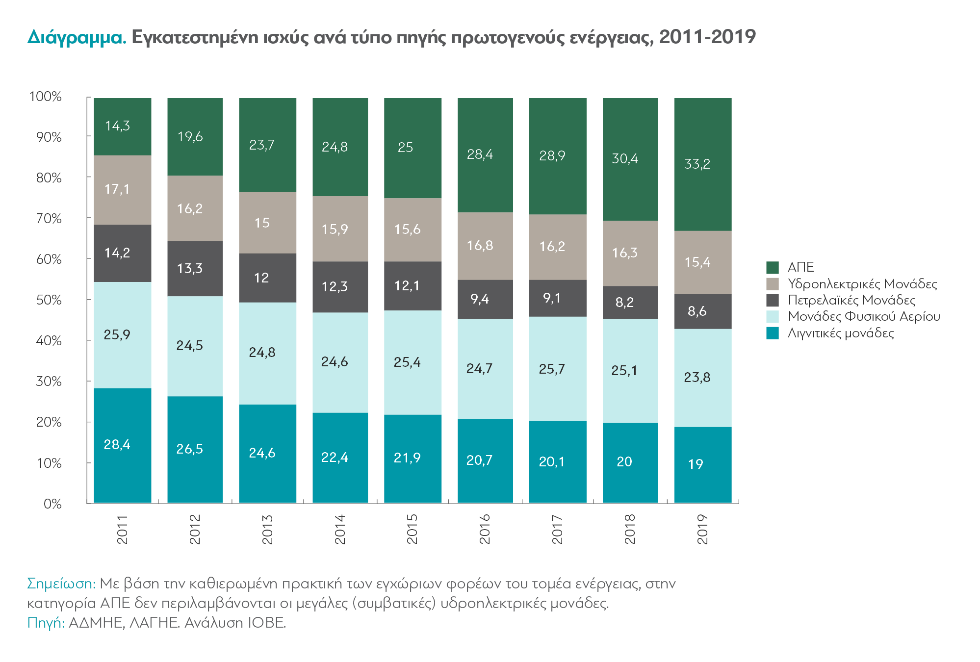 Αυτή η μετάβαση έχει ξεκινήσει και στην Ελλάδα. Η ισχύς ηλεκτροπαραγωγικών μονάδων που βασίζονται στα ορυκτά καύσιμα μειώνεται και παράλληλα οι ανανεώσιμες πηγές ενέργειας (ΑΠΕ) που χρησιμοποιούνται για την παραγωγή ηλεκτρικού ρεύματος αυξάνονται θεαματικά τα τελευταία χρόνια. Πλέον το 1/3 της παραγωγής ηλεκτρικού ρεύματος στην Ελλάδα προέρχεται από τις ΑΠΕ. Σκεφτείτε ότι η εγκατεστημένη ισχύς των φωτοβολταϊκών σταθμών στη χώρα πενταπλασιάστηκε μόνο μέσα σε δύο χρόνια, από το 2011 ως το 2013.