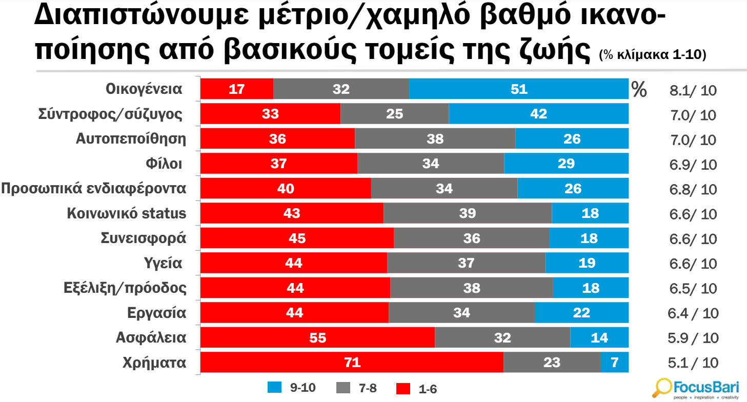 • Επτά στους δέκα είναι δυσαρεστημένοι με τα οικονομικά τους, πράγμα που προφανώς επηρεάζει και συμπαρασύρει τον βαθμό ικανοποίησης και από τους άλλους τομείς, με κύρια επιρροή…