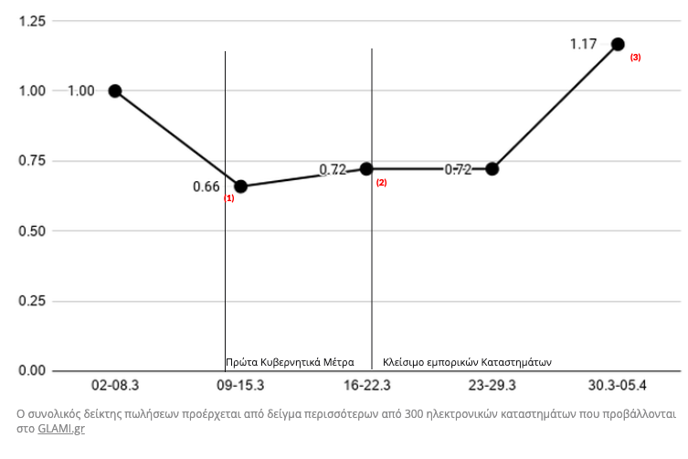 Αισιόδοξα είναι τα μηνύματα για τα ελληνικά fashion eshop σύμφωνα με την έρευνα της μηχανής αναζήτησης μόδας GLAMI. Παρόλη την αρχική πτώση στις πωλήσεις (που ξεπέρασε το 35%) το πρώτο διάστημα των μέτρων αντιμετώπισης του COVID-19 η αύξηση που παρατηρείται σε παραγγελίες, αναζητήσεις και κυρίως σε πωλήσεις μέχρι και την πρώτη εβδομάδα του Απριλίου είναι μεγαλύτερη και από την προ Covid-19 περίοδο (+15% στις πωλήσεις).