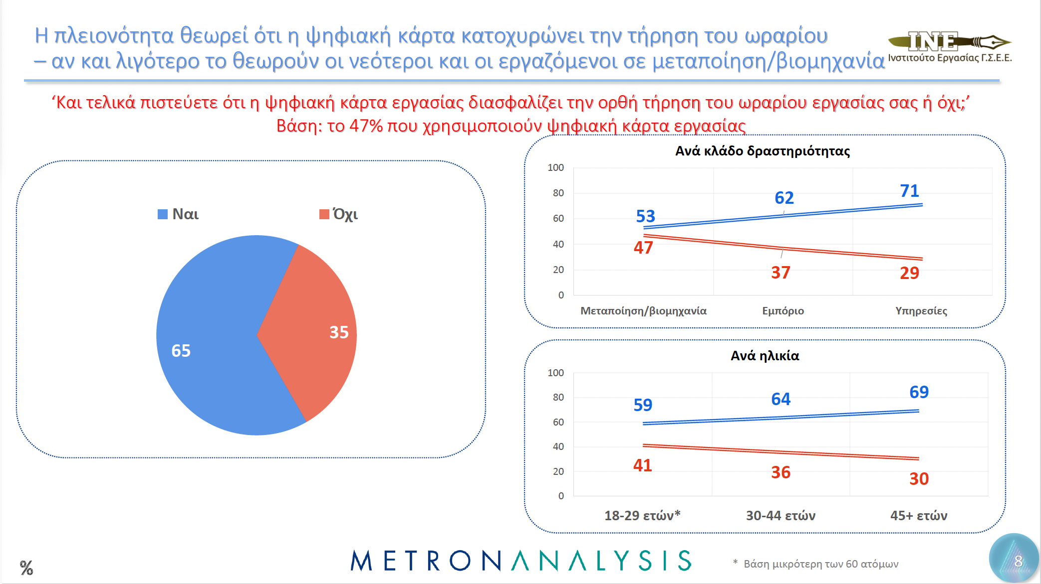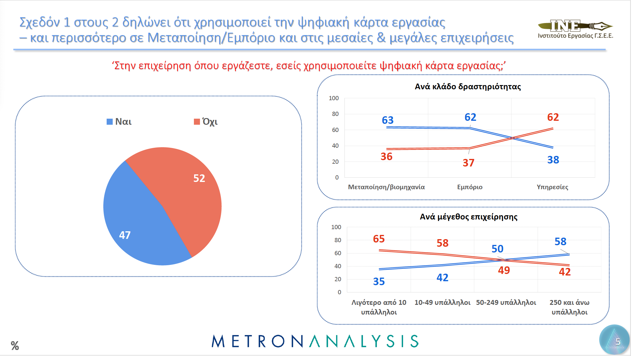 Σύμφωνα με τα ευρήματα της έρευνας, σχεδόν 1 στους 2 εργαζόμενους χρησιμοποιεί πλέον την ψηφιακή κάρτα εργασίας, με μεγαλύτερη διείσδυση στους κλάδους της μεταποίησης και του εμπορίου και σε μεσαίες και μεγάλες επιχειρήσεις.