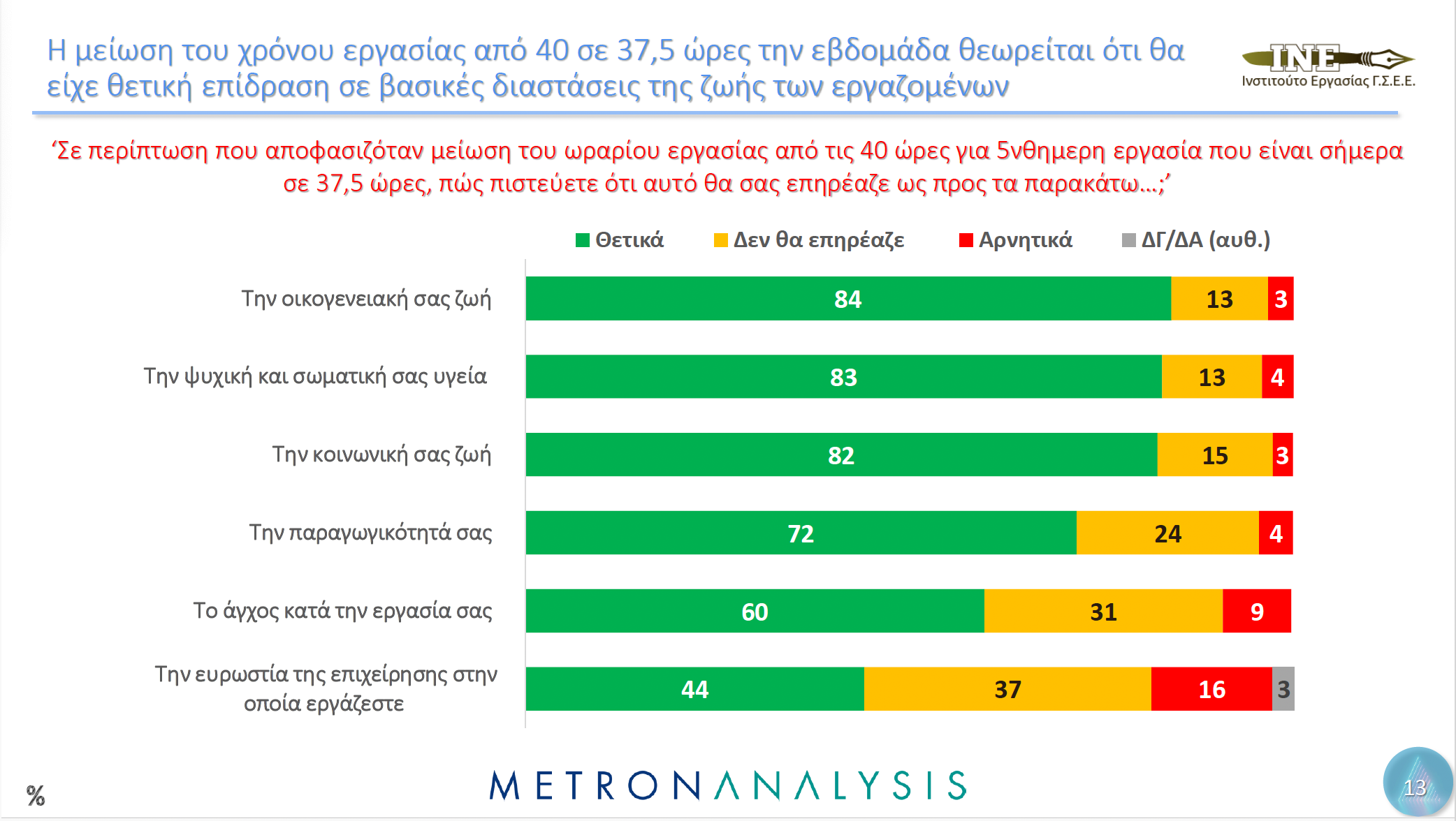 Περίπου το 90% των ερωτηθέντων βλέπει θετικά τη μείωση του εβδομαδιαίου ωραρίου από τις 40 στις 37,5 ώρες, με σαφή προτίμηση στη διατήρηση των αποδοχών.