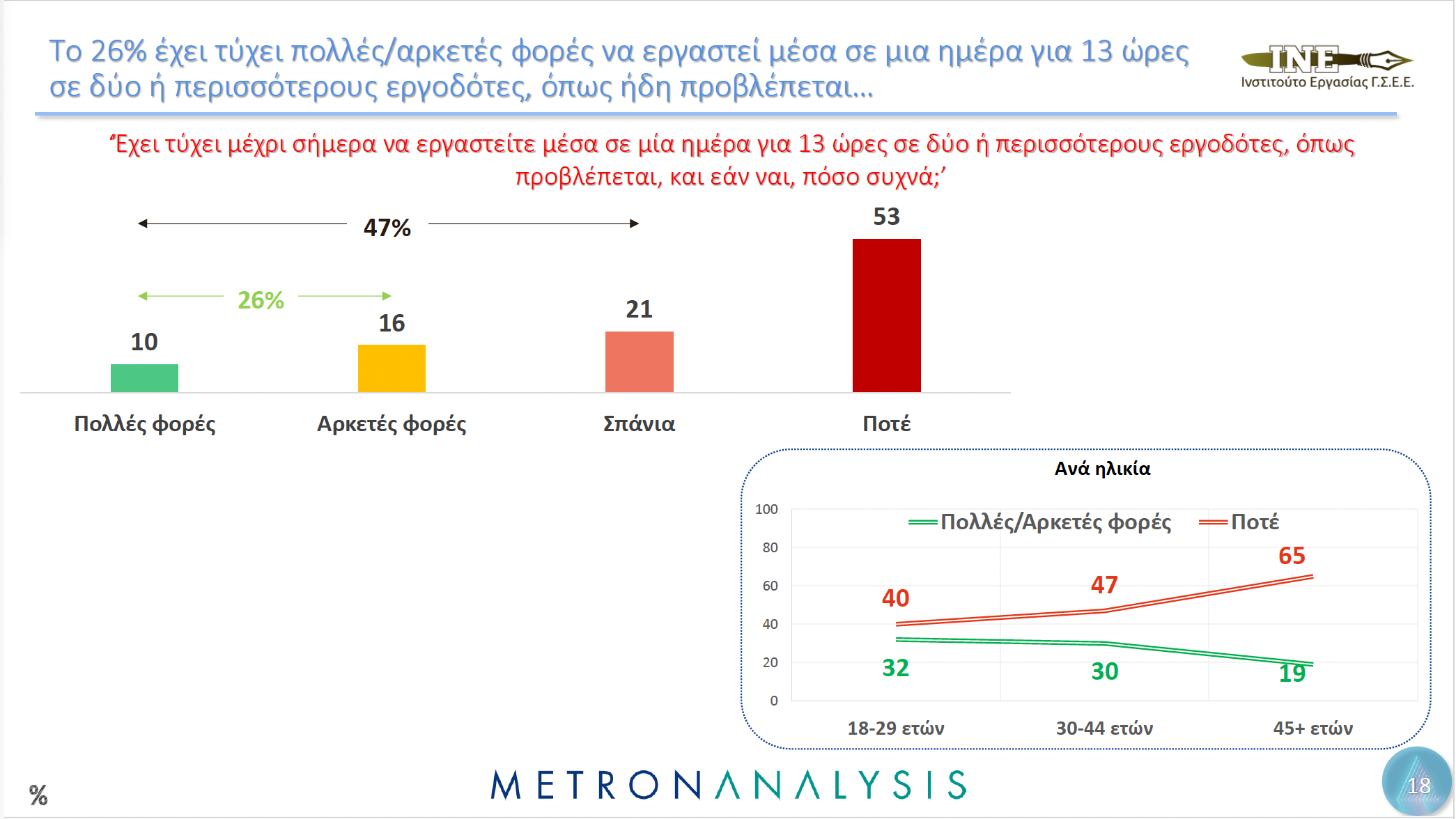 Αν και οι νέες ρυθμίσεις για δυνατότητα εργασίας έως και 13 ώρες ημερησίως εφαρμόζονται ήδη, ένα σημαντικό ποσοστό (26% για δύο ή περισσότερους εργοδότες και 33% για έναν εργοδότη) έχει δουλέψει τέτοιες βάρδιες, κυρίως κατόπιν αιτήματος των εργοδοτών.