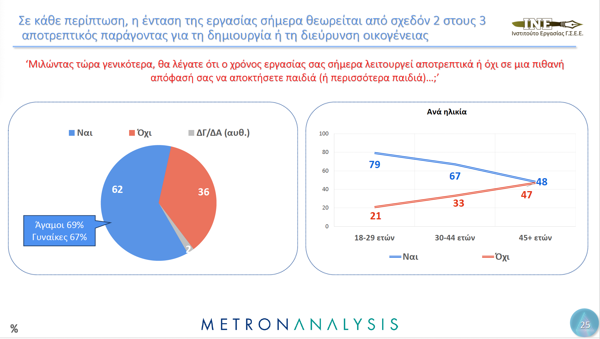 Ένα από τα πιο ανησυχητικά ευρήματα είναι ότι το 62% των εργαζομένων θεωρεί ότι ο σημερινός ρυθμός εργασίας δυσχεραίνει την απόφαση απόκτησης ή διεύρυνσης της οικογένειας. Το ποσοστό αυτό είναι υψηλότερο μεταξύ των άγαμων και των γυναικών, αναδεικνύοντας μια κοινωνική διάσταση που συνδέεται με την ισορροπία εργασιακής και οικογενειακής ζωής.