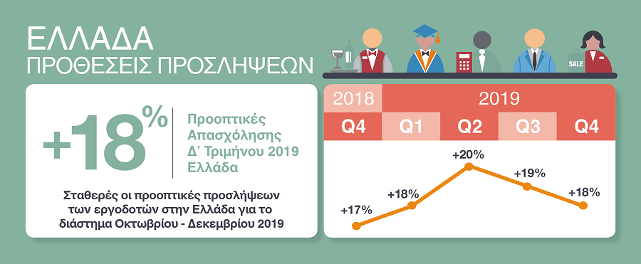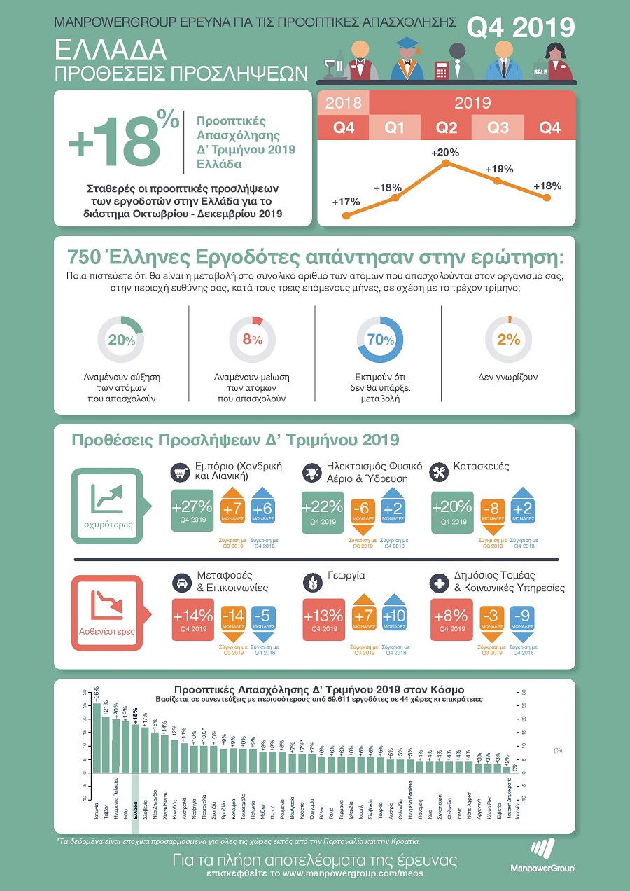 Η έρευνα της ManpowerGroup για το τελευταίο τρίμηνο του 2019 αποκαλύπτει ότι οι εργοδότες αναμένουν αύξηση του αριθμού των απασχολουμένων σε 43 από τις 44 χώρες και επικράτειες που συμμετείχαν στην έρευνα, στο διάστημα έως και το τέλος Δεκεμβρίου 2019, ενώ οι εργοδότες σε μία μόνο χώρα δεν προβλέπουν καμία αλλαγή στις προθέσεις προσλήψεων. Οι ισχυρότερες προοπτικές προσλήψεων καταγράφονται στην Ιαπωνία, την Ταϊβάν, τις ΗΠΑ, την Ινδία και την Ελλάδα, ενώ η πιο αδύναμη δραστηριότητα προσλήψεων αναμένεται να καταγραφεί σε Ισπανία, Τσεχία, Αργεντινή, Κόστα Ρίκα και Ελβετία.