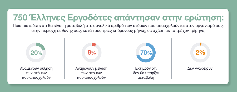 Βάσει των αποτελεσμάτων της έρευνα Προοπτικών Απασχόλησης της ManpowerGroup που δημοσιεύονται σήμερα, οι εργοδότες στην Ελλάδα καταγράφουν σταθερές προθέσεις προσλήψεων για το χρονικό διάστημα από τον Οκτώβριο έως και τον Δεκέμβριο. Με το 20% των εργοδοτών να προβλέπει αύξηση του αριθμού των απασχολουμένων, το 8% να προβλέπει μείωση και το 70% να μην αναμένει κάποια αλλαγή, οι Συνολικές Προοπτικές Απασχόλησης διαμορφώνονται στο +18%. Τα σχέδια προσλήψεων παραμένουν σχετικά σταθερά σε σχέση με το προηγούμενο τρίμηνο αλλά και το αντίστοιχο διάστημα του προηγούμενου έτους.