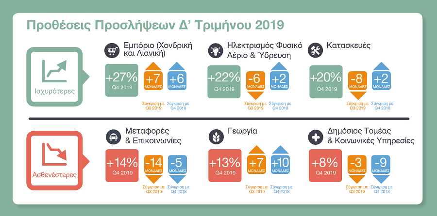 Οι εργοδότες και στους εννέα τομείς οικονομικής δραστηριότητας αναμένουν να αυξήσουν τον αριθμό των ατόμων που απασχολούν κατά το Δ’ Τρίμηνο του 2019. Οι εργοδότες του τομέα του Εμπορίου (Χονδρική & Λιανική) καταγράφουν τις ισχυρότερες προοπτικές προσλήψεων, με αισιόδοξες Συνολικές Προοπτικές Απασχόλησης της τάξης του +27%. Παράλληλα, οι εργοδότες του τομέα Ηλεκτρισμός, Φυσικό Αέριο & Ύδρευση προβλέπουν σταθερή αύξηση του αριθμού απασχολουμένων, καταγράφοντας Προοπτικές της τάξης του +22%, ενώ οι Προοπτικές στον τομέα των Κατασκευών ανέρχονται σε +20%. Θετικός ρυθμός προσλήψεων αναμένεται στον τομέα του Τουρισμού, με Προοπτικές της τάξης του +17%, αλλά και στους τομείς των Χρηματοοικονομικών, Ασφαλειών, Ακίνητης Περιουσίας & Παροχής Υπηρεσιών προς Επιχειρήσεις και Βιομηχανίας / Παραγωγής, όπου οι Προοπτικές ανέρχονται σε +16% και +15% αντίστοιχα. Στον τομέα του Δημοσίου & Κοινωνικών Υπηρεσιών, οι εργοδότες αναφέρουν τα πιο εξασθενημένα σχέδια προσλήψεων, με Συνολικές Προοπτικές Απασχόλησης της τάξης του +8%.