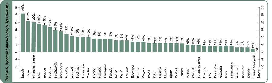 Σε σύγκριση με το προηγούμενο τρίμηνο, οι εργοδότες σε 15 από τις 44 χώρες και επικράτειες αναφέρουν ενισχυμένες προθέσεις προσλήψεων, ενώ οι εργοδότες σε άλλες 23 καταγράφουν αποδυνάμωση του ρυθμού προσλήψεων. Σε έξι, δεν αναμένεται καμία αλλαγή. Σε σύγκριση με τα αποτελέσματα του τέταρτου τριμήνου του 2018, τα σχέδια προσλήψεων ενισχύονται σε 15 χώρες και επικράτειες, αποδυναμώνονται σε 23 και διατηρούνται αμετάβλητα σε έξι.