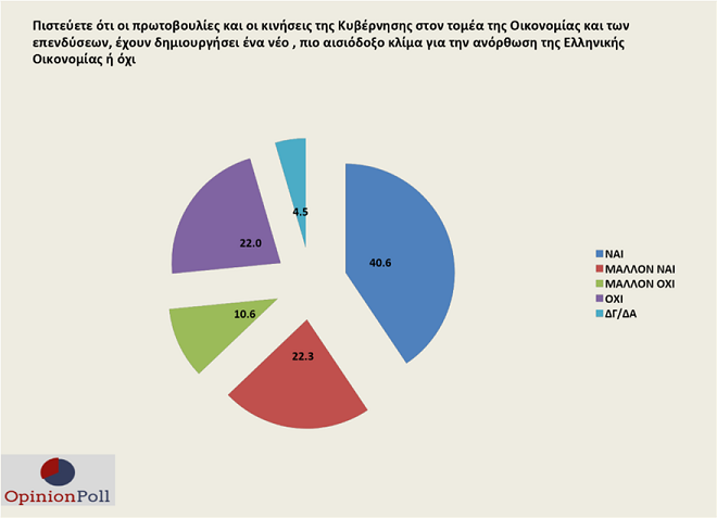 Εντυπωσιακή παραμένει η εικόνα για τις προσπάθειες της κυβέρνησης στην οικονομία. Τις επικροτεί το 63%. Πέραν της ΝΔ, θετικά απαντά το 44% του ΣΥΡΙΖΑ, το 72% του ΚΙΝΑΛ , το 34% του Κ.Κ.Ε, το 61% της ΕΛΛΗΝΙΚΗΣ ΛΥΣΗΣ και το 57% του ΜΕΡΑ 25! Το πεδίο αυτό αναδεικνύεται το ατού της κυβέρνησης.