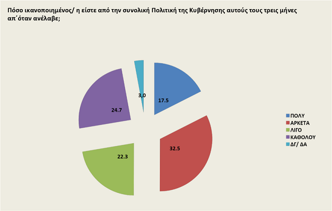 Η ικανοποίηση από τη γενική εικόνα της κυβέρνησης φτάνει στο 50%, με το 47% των ερωτηθέντων να έχει αρνητική άποψη. Η διείσδυση της κυβέρνησης πέραν του χώρου της ΝΔ είναι ισχυρή: το 20% του ΣΥΡΙΖΑ και το 57% του ΚΙΝΑΛ έχει θετική άποψη.