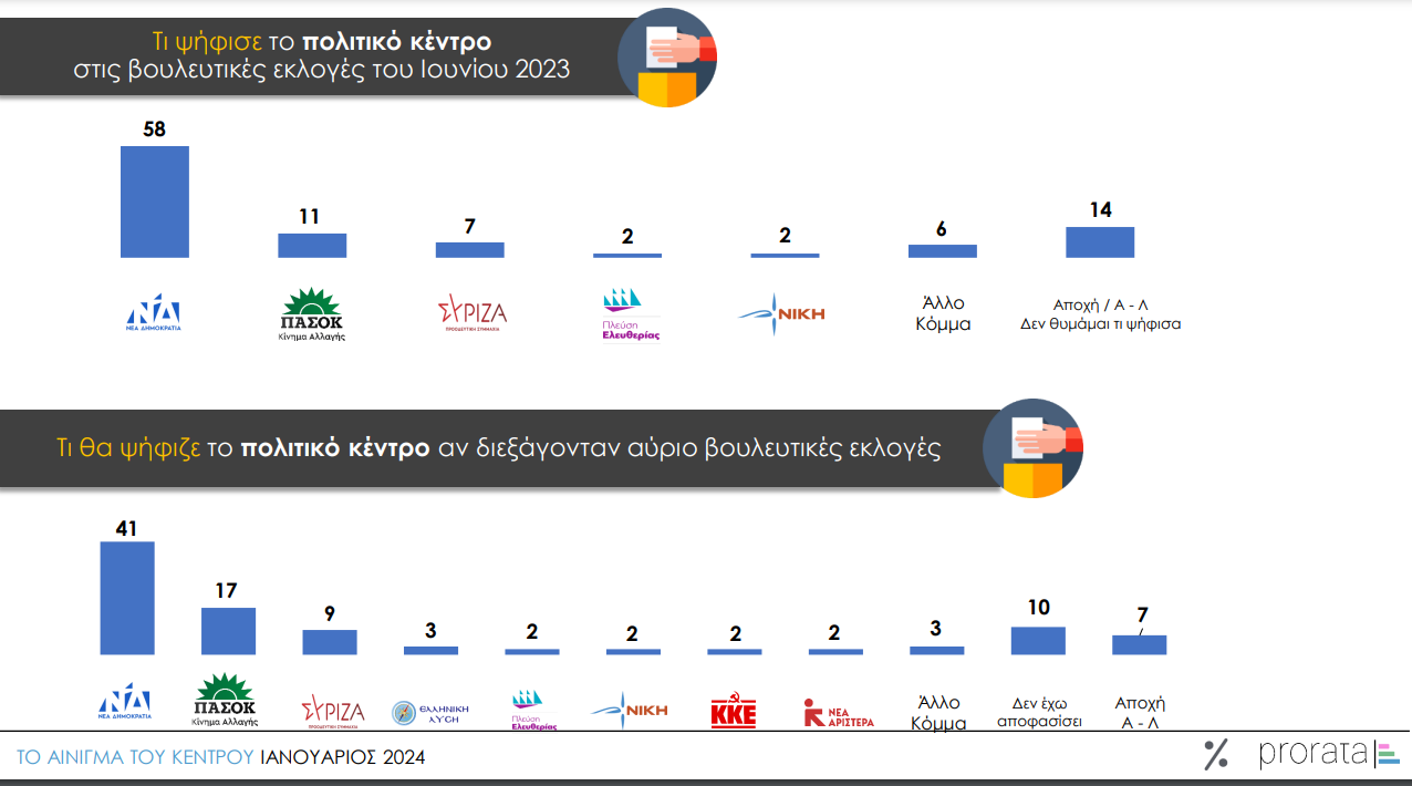 Η Prorata παρουσίασε τη Δευτέρα 15 Ιανουαρίου μια μεγάλη έρευνα που «έτρεξε» 1.230 ατόμων στο διάστημα Δεκεμβρίου 2023 – Ιανουαρίου 2024, υπό τον τίτλο «Το αίνιγμα του κέντρου».