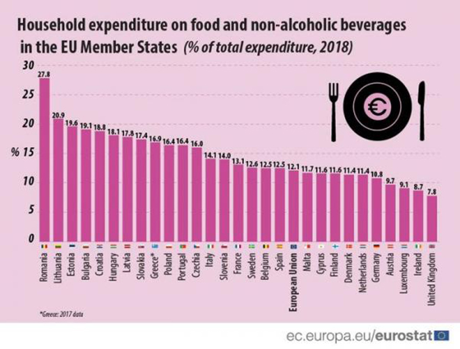 Το υψηλότερο ποσοστό καταγράφηκε στην Ρουμανία, όπου το 27,8% της καταναλωτικής δαπάνης (1/5) προορίζεται για τροφή και μη αλκοολούχα ποτά, δηλαδή υπερδιπλάσιο σε σχέση με τον κοινοτικό μέσο όρο. Τα επόμενα υψηλότερα ποσοστά καταγράφονται στη Λιθουανία (20,9%) και στην Εσθονία (19,6%).