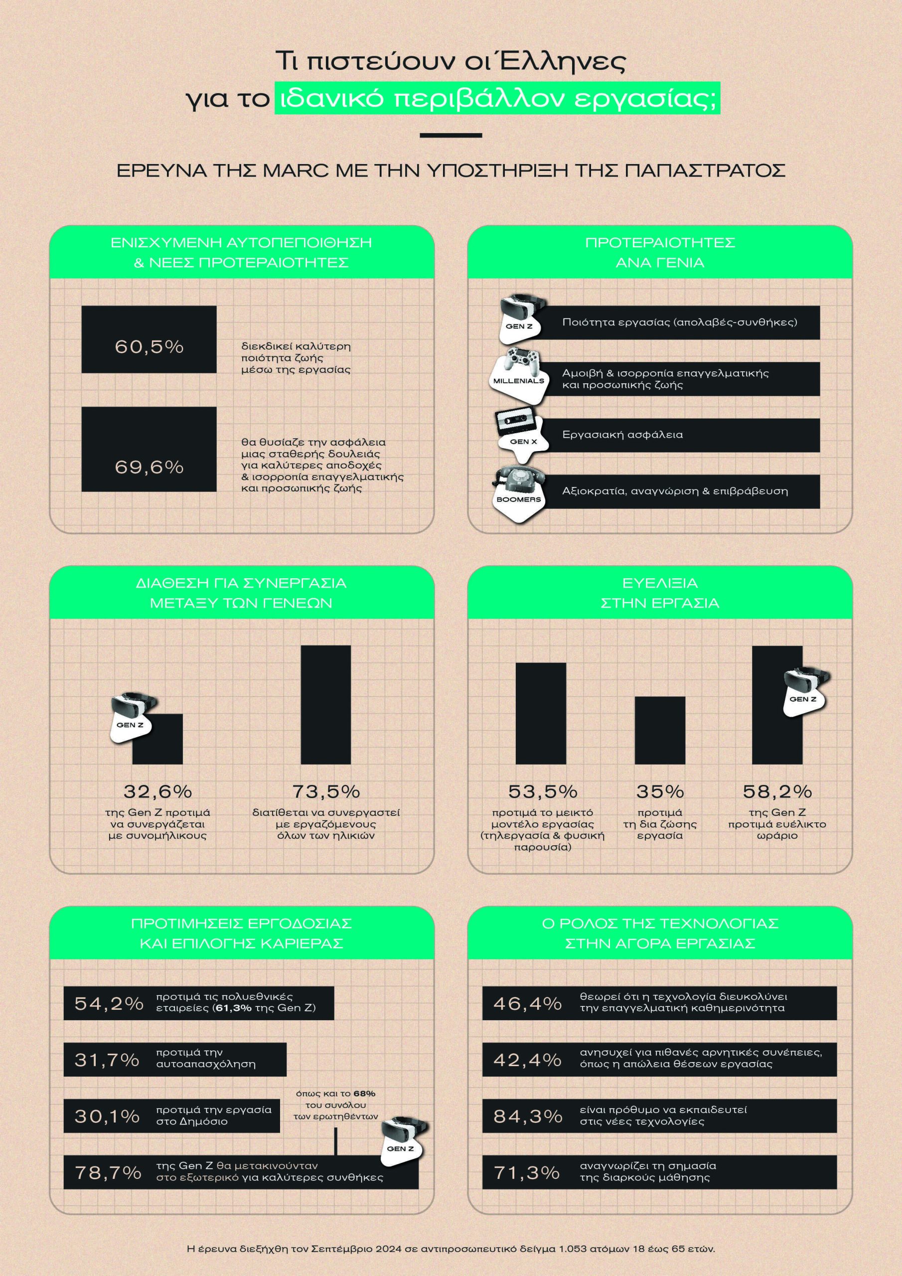 Οι προτεραιότητες των Ελλήνων εργαζόμενων αλλάζουν δυναμικά, όπως αποτυπώνεται στη νέα έρευνα που πραγματοποίησε η MARC για λογαριασμό της Παπαστράτος. Οι αμοιβές, η ισορροπία μεταξύ επαγγελματικής και προσωπικής ζωής και οι ευκαιρίες εξέλιξης διαμορφώνουν ένα νέο τοπίο στις επαγγελματικές επιδιώξεις των εργαζομένων. Παράλληλα, η τεχνολογία και η ευελιξία στις μορφές απασχόλησης παίζουν καθοριστικό ρόλο στη διαμόρφωση του εργασιακού μοντέλου του μέλλοντος. Η έρευνα διεξήχθη σε αντιπροσωπευτικό δείγμα 1.053 ατόμων 18 έως 65 ετών και αναδεικνύει τις διαφοροποιήσεις μεταξύ των γενεών ως προς τις προσδοκίες και τις επιλογές τους.
