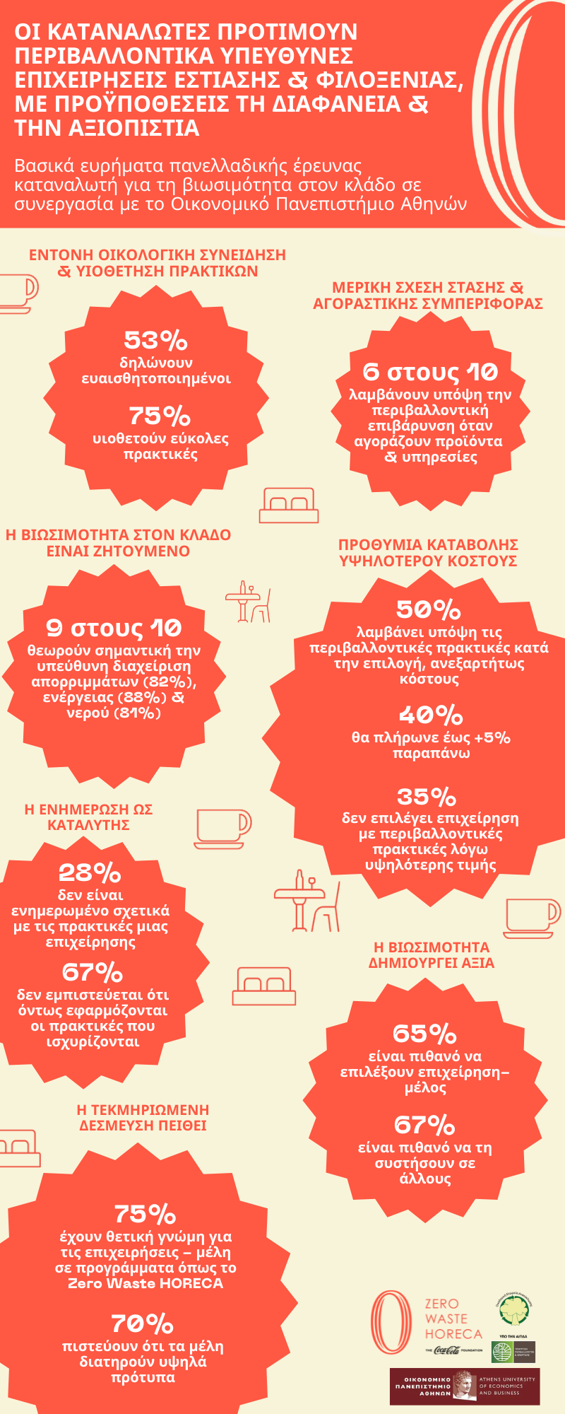 Τον καθοριστικό ρόλο που διαδραματίζουν οι ορατές, αξιόπιστες και τεκμηριωμένες περιβαλλοντικές πρακτικές, στη διαμόρφωση της εικόνας, της επιλογής και της σύστασης επιχειρήσεων του κλάδου HORECA στην Ελλάδα, αναδεικνύει η πανελλαδική έρευνα με τίτλο, «Βιωσιμότητα στον κλάδο HORECA: Τι ζητούν οι Καταναλωτές», που υλοποιήθηκε από το Οικονομικό Πανεπιστήμιο Αθηνών με τη χρηματοδότηση της Coca-Cola στην Ελλάδα.