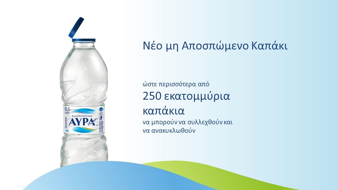 Παράλληλα, παρουσιάστηκε η νέα συσκευασία του Φυσικού Μεταλλικού Νερού ΑΥΡΑ με μη αποσπώμενο καπάκι, που θα κυκλοφορήσει στην αγορά στο τέλος του μήνα. Με τον τρόπο αυτό, η εταιρεία εφαρμόζει την Ευρωπαϊκή Οδηγία και τη σχετική ελληνική νομοθεσία νωρίτερα από το προβλεπόμενο χρονικό πλαίσιο, συμβάλλοντας ώστε περισσότερα από 250 εκατομμύρια καπάκια να μπορούν να συλλεχθούν και να ανακυκλωθούν.