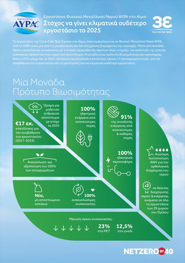 Το όραμά της για μηδενικές εκπομπές διοξειδίου του άνθρακα στη μονάδα παραγωγής του Φυσικού Μεταλλικού Νερού ΑΥΡΑ με στόχο το 2025, ανακοίνωσε η Coca-Cola Τρία Έψιλον στο πλαίσιο εκδήλωσης που υλοποιήθηκε στις 10 Μαΐου στο Αίγιο. Το εργοστάσιο της εταιρείας στο Αίγιο είναι μία μονάδα πρότυπο βιωσιμότητας και καινοτομίας. Η μετατροπή του σε ένα κλιματικά ουδέτερο εργοστάσιο αποτελεί το επόμενο βήμα στη βιώσιμη ανάπτυξη του εργοστασίου, στο πλαίσιο της στρατηγικής της εταιρείας για μηδενικές εκπομπές διοξειδίου του άνθρακα σε ολόκληρη την αλυσίδα αξίας της, μέχρι το 2040.