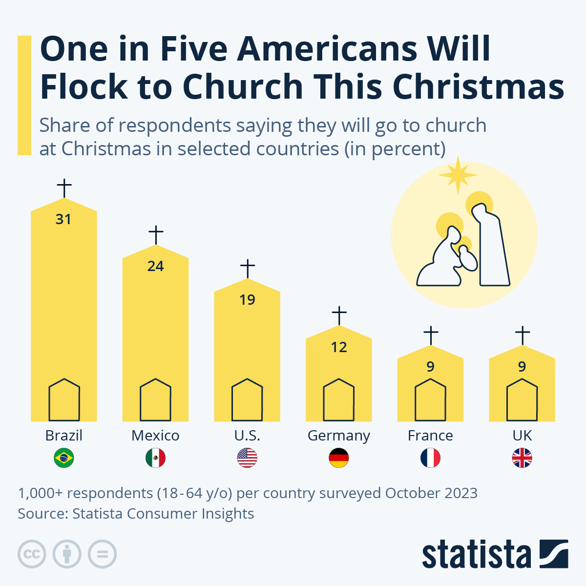 Σύμφωνα με τη σχετική έρευνα, η χώρα με το μεγαλύτερο ποσοστό πολιτών που δήλωσαν πως σκοπεύουν να πάνε σε μια χριστουγεννιάτικη λειτουργία φέτος είναι η Βραζιλία, με 31%.
