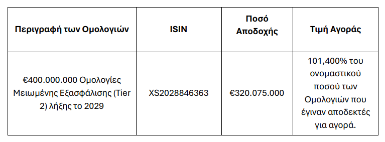 Πιο αναλυτικά, η Εθνική Τράπεζα της Ελλάδος Α.Ε. (η Τράπεζα ή ο Προσφέρων) ανακοινώνει, σύμφωνα με τον Κανονισμό (ΕΕ) 596/2014 και τον ελληνικό νόμο 3556/2007, αναφορικά με την προαιρετική πρόταση εξαγοράς έναντι μετρητών που εκκίνησε την 19 Μαρτίου 2024 (η Πρόταση Εξαγοράς) στους κατόχους των €400.000.000 Ομολογιών Μειωμένης Εξασφάλισης (Tier 2) εκδόσεώς της που λήγουν το 2029 (οι Ομολογίες) ότι ο Προσφέρων θα δεχθεί να αγοράσει όλες τις εγκύρως προσφερθείσες Ομολογίες και ότι το Ποσό Αποδοχής ανέρχεται σε €320.075.000, υπό την προϋπόθεση της επιτυχούς ολοκλήρωσης (κατά την απόλυτη διακριτική ευχέρεια του Προσφέροντος) της έκδοσης των Νέων Ομολογιών (η Προϋπόθεση της Νέας Έκδοσης) κατά την ή προ της Ημερομηνίας Διακανονισμού (όπως ορίζεται κατωτέρω). Περίληψη των αποτελεσμάτων παρέχεται κατωτέρω: