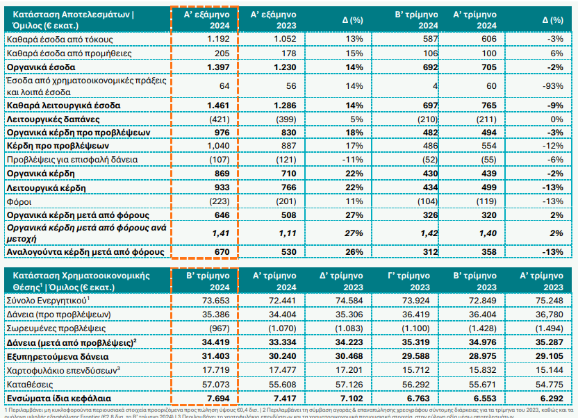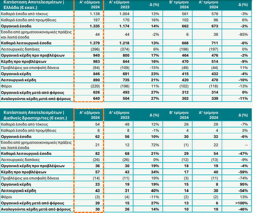 Σε αυτή την ευνοϊκή μακροοικονομική συγκυρία, επιτύχαμε για μία ακόμη φορά ισχυρά οικονομικά αποτελέσματα το Α’ εξάμηνο 2024. Πράγματι, τα οργανικά κέρδη μετά από φόρους αυξήθηκαν κατά 27% σε ετήσια βάση, στα €646 εκατ. το Α’ εξάμηνο 2024, με τον δείκτη απόδοσης ενσώματων ιδίων κεφαλαίων να διαμορφώνεται σε 17,4%.