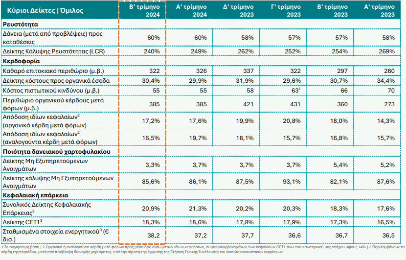 - Ο δείκτης απόδοσης ιδίων κεφαλαίων διαμορφώθηκε στο 17,4% σε επίπεδο οργανικών κερδών μετά φόρων και σε 18,1% σε επίπεδο αναλογούντων κερδών μετά φόρων το Α’ εξάμηνο 2024, χωρίς να αναπροσαρμόζουμε για το υπερβάλλον κεφάλαιο CET1 άνω των εποπτικών ορίων
