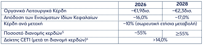 Η ανάπτυξη θα προέλθει κυρίως από την οργανική αύξηση των χορηγήσεων (σωρευτική ετήσια μεταβολή περίπου +7,5%), από τα οφέλη και τις συνέργειες από την ηγετική θέση στην Κύπρο, από την εξαγορά της Eurolife και την περαιτέρω ανάπτυξη των εργασιών στη Διαχείριση Περιουσίας (σωρευτική ετήσια μεταβολή κατά περίπου +16% των υπό διαχείριση κεφαλαίων). Οι χρηματοοικονομικοί στόχοι της περιόδου 2026-2028 έχουν ως εξής: