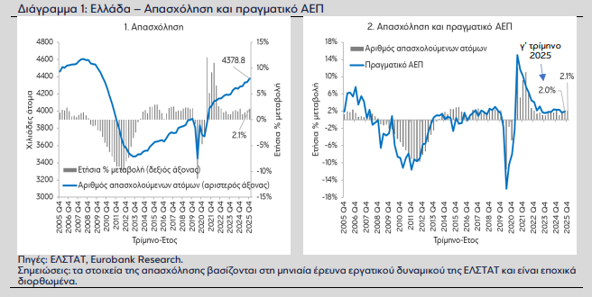 Σύμφωνα με τη μηνιαία έρευνα εργατικού δυναμικού της Ελληνικής Στατιστικής Αρχής (ΕΛΣΤΑΤ), ο ρυθμός αύξησης της απασχόλησης επιταχύνθηκε το δ’ τρίμηνο 2025, εξέλιξη που εκπέμπει ένα θετικό μήνυμα για τη βραχυπρόθεσμη δυναμική του πραγματικού Ακαθάριστου Εγχώριου Προϊόντος (ΑΕΠ), επισημαίνει η Eurobank στο τελευταίο της οικονομικό δελτίο «Επτά Ημέρες Οικονομία». Αναλυτικά, όπως παρουσιάζεται στο Διάγραμμα 1.1, το ύψος της απασχόλησης διαμορφώθηκε σε 4.378,8 χιλ. άτομα, καταγράφοντας ενίσχυση της τάξης του 0,9% σε τριμηνιαία βάση και 2,1% σε ετήσια βάση, από 0,2% και 1,9% αντίστοιχα το γ’ τρίμηνο 2025. [1]