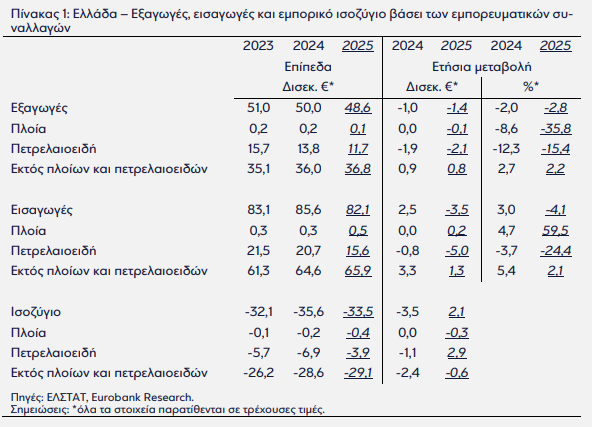 Το εμπορικό έλλειμμα περιορίστηκε στα €33,5 δισ. (-5,9%) το 2025, αποκλειστικά λόγω της μεγάλης μείωσης των εισαγωγών πετρελαιοειδών (-24,4%), ενώ το έλλειμμα εκτός πετρελαιοειδών και πλοίων επιδεινώθηκε.