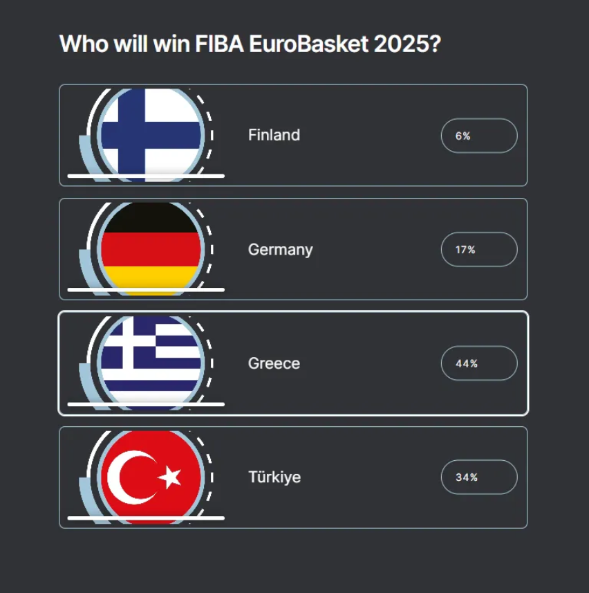 Η FIBA, μέσω της σελίδας της για το EuroBasket 2025, ξεκίνησε ψηφοφορία για τους οπαδούς σχετικά με την ομάδα που θα κατακτήσει το χρυσό μετάλλιο. Στις πρώτες ώρες της ψηφοφορίας, η Ελλάδα βρίσκεται στην πρώτη θέση με 44%.