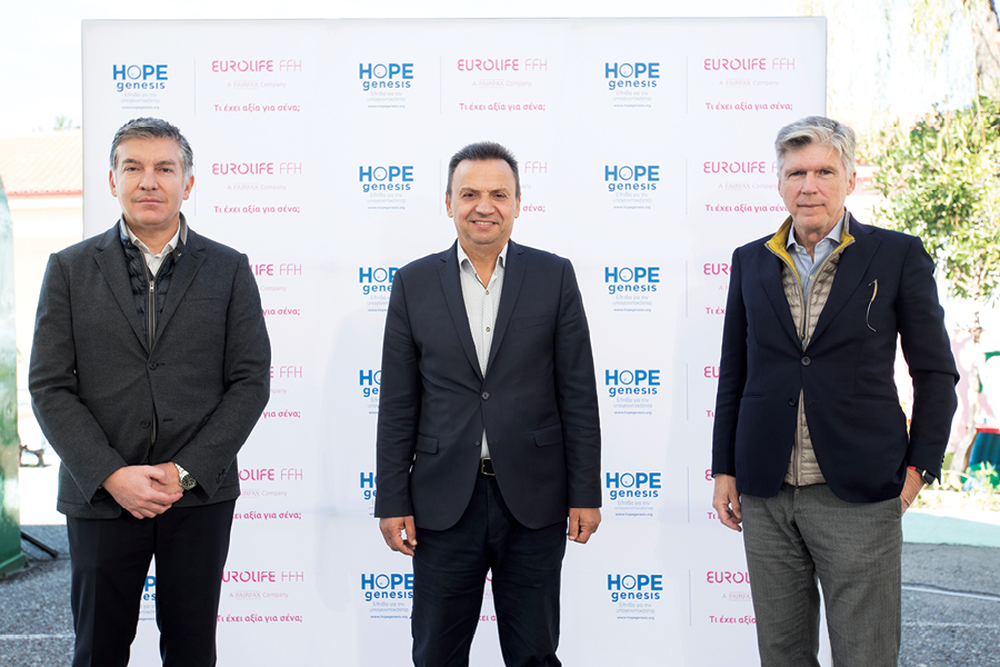 Ο Στέφανος Χανδακάς, Πρόεδρος & Ιδρυτής της HOPEgenesis, ο Αλέξης Καρδαμπίκης, Δήμαρχος Αγράφων, και ο Αλέξανδρος Σαρρηγεωργίου, Πρόεδρος & Διευθύνων Σύμβουλους της Eurolife FFH, στα εγκαίνια του παιδικού σταθμού στην Παλαιοκατούνα Αγράφων