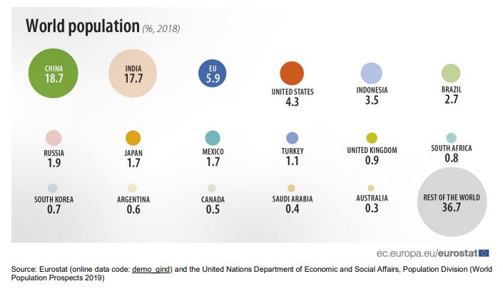 Η ΕΕ είχε πληθυσμό 450 εκατ. κατοίκων το 2018, ο οποίος αντιστοιχούσε στο 5,9% του παγκόσμιου πληθυσμού (7,6 δισεκατομμύρια), κατέχοντας την τρίτη θέση πίσω από την Κίνα και την Ινδία, οι οποίες είχαν πάνω από 1,4 δισ. κατοίκους και σχεδόν 1,4 δισ. κατοίκους (18,7% και 17,7% του παγκόσμιου πληθυσμού), αντίστοιχα. Τα τρία τέταρτα (75%) του πληθυσμού της ΕΕ ζούσε σε αστικές περιοχές, ποσοστό πολύ υψηλότερο από το 55% που είναι ο μέσος όρος παγκοσμίως.