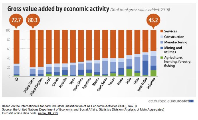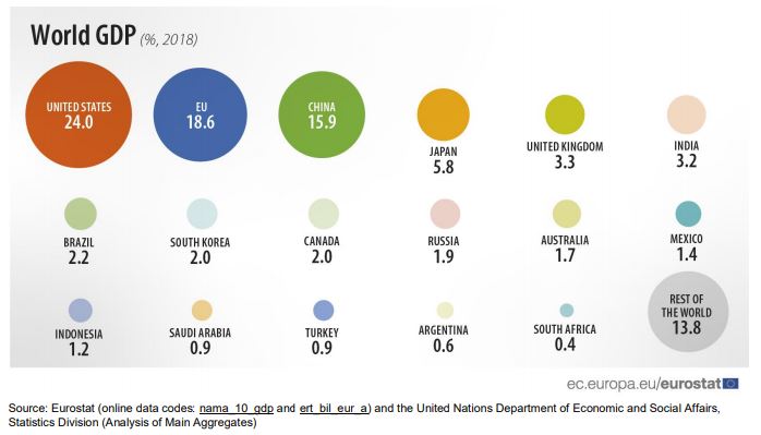 H Ευρωπαϊκή Ένωση έχει τη δεύτερη μεγαλύτερη οικονομία στον κόσμο, αλλά η συμβολή της στο παγκόσμιο ΑΕΠ έχει μειωθεί σημαντικά σε σχέση με το 2008, σύμφωνα με στοιχεία που ανακοίνωσε σήμερα η Ευρωπαϊκή Στατιστική Υπηρεσία (Eurostat). Συγκεκριμένα, στην ΕΕ αντιστοιχούσε το 18,6% του παγκόσμιου ΑΕΠ το 2019, πίσω από τις ΗΠΑ που ήταν η μεγαλύτερη οικονομία με το 24% του παγκόσμιου ΑΕΠ, ενώ την πλησίασε πολύ η Κίνα (με 15,9% του παγκόσμιου ΑΕΠ). Το 2008, η συμμετοχή της ΕΕ στο παγκόσμιο ΑΕΠ ανερχόταν στο 25,6% και της Κίνας στο 7,2%. Ο τομέας των υπηρεσιών της ευρωπαϊκής οικονομίας αντιστοιχούσε στο 73% της ακαθάριστης προστιθέμενης αξίας της το 2018, το τέταρτο υψηλότερο ποσοστό στον κόσμο μετά από αυτό των ΗΠΑ και της Βρετανίας (και οι δύο 80%) και της Βραζιλίας (73%).