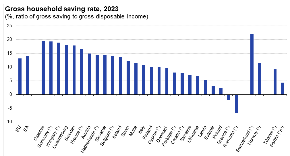 Κατά μέσο όρο στην ΕΕ, το ποσοστό αποταμίευσης των νοικοκυριών στην ΕΕ ήταν 13,2% το 2023, ενώ το ποσοστό για τη ζώνη του ευρώ ήταν υψηλότερο, 14,1%, ενώ υπήρχαν 11 χώρες της ΕΕ που κατέγραψαν ποσοστά αποταμίευσης κάτω του 10,0%.
