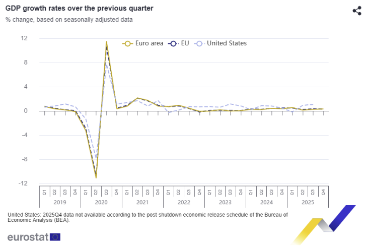 Το τέταρτο τρίμηνο του 2025, το εποχικά προσαρμοσμένο ΑΕΠ αυξήθηκε κατά 0,3% τόσο στην Ευρωζώνη όσο και στην Ευρωπαϊκή Ένωση, σε σύγκριση με το προηγούμενο τρίμηνο, σύμφωνα με την δεύτερη εκτίμηση που δημοσίευσε η Eurostat, η στατιστική υπηρεσία της ΕΕ. Το τρίτο τρίμηνο του 2025, το ΑΕΠ είχε αυξηθεί κατά 0,3% στην Ευρωζώνη και κατά 0,4% στην ΕΕ.