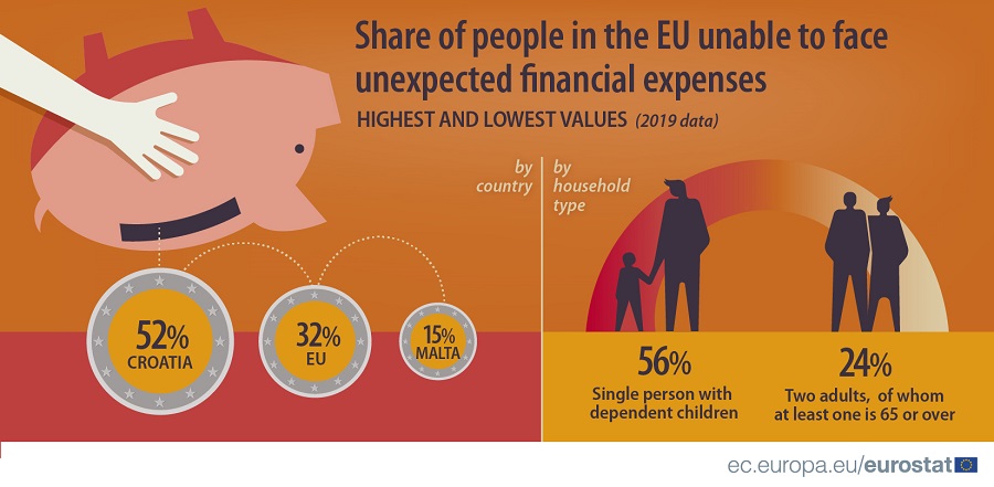 Μεταξύ των κρατών μελών της ΕΕ, το μερίδιο των ατόμων που δεν μπορούσαν να αντιμετωπίσουν απροσδόκητα οικονομικά έξοδα ήταν υψηλότερο στην Κροατία, με ποσοστό 52%.