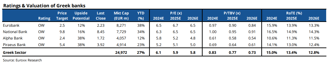 «Ως εκ τούτου, διατηρούμε την ανοδική μας άποψη για τις ελληνικές τράπεζες που τυγχάνουν διαπραγμάτευσης κατά μέσο όρο με όρους P/E στο 6,0x το 2024 και το 2025, με discount 15-20% έναντι των άλλων τραπεζικών ιδρυμάτων στην ΕΕ (σε εύρος 7,0-7,5x P/E το 2024- 25).