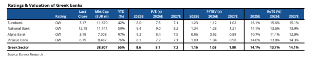 Ενόψει των αποτελεσμάτων, η Euroxx αναδεικνύει την Eurobank και την Piraeus Bank ως τις κορυφαίες της επιλογές στον ελληνικό τραπεζικό τομέα, δίνοντας και στις δύο τράπεζες αξιολόγηση “Overweight”.