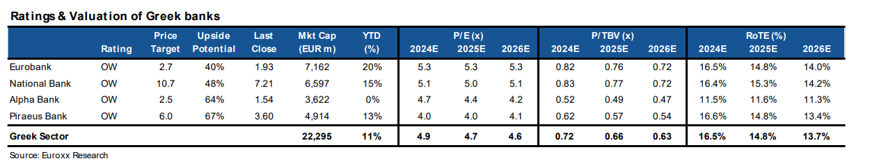 Η επιστροφή στις πληρωμές μερισμάτων και τα ενθαρρυντικά στοιχεία για την αύξηση των δανείων το β’ τρίμηνο του 2024 θα είναι βασικοί καταλύτες, στο μέλλον, για μια περαιτέρω επαναξιολόγηση.