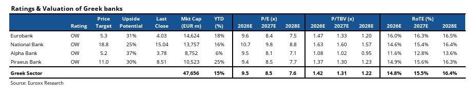 Συνολικά, διατηρεί θετική στάση για τις ελληνικές τράπεζες, με πίστη στις προβλέψεις κερδοφορίας για την περίοδο 2026-2028 και εκτίμηση για άνοδο στις παραδοχές της για τα ποσοστά διανομής.