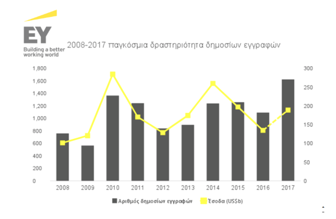 Το 2017 αναδείχθηκε στη χρονιά με την εντονότερη δραστηριότητα δημοσίων εγγραφών μετά το 2007. Αυτό προκύπτει από την τριμηνιαία έρευνα της ΕΥ «Global IPO trends: Q4 2017», τα ευρήματα της οποίας δημοσιεύονται σήμερα.
