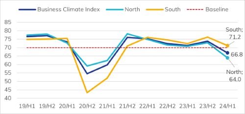 Σύμφωνα με τα στοιχεία, ο Δείκτης Επιχειρηματικού Κλίματος στις χώρες του Βορρά υποχώρησε στις 66,8 μονάδες, πέφτοντας κάτω από τη βασική γραμμή των 70, υποδεικνύοντας ότι οι ΜμΕ βρίσκονται σε ύφεση. Αντίστοιχα για τις ευρωπαϊκές χώρες του Νότου ο δείκτης μειώθηκε στις 71,3 μονάδες, αλλά παρέμεινε πάνω από τη βασική γραμμή.