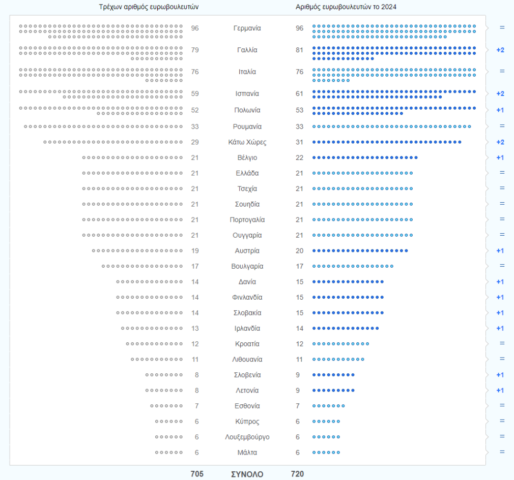 Μετά τις ευρωεκλογές, ο αριθμός των εδρών του Ευρωπαϊκού Κοινοβουλίου θα αυξηθεί από 705 σε 720, αντικατοπτρίζοντας τις δημογραφικές αλλαγές στα κράτη μέλη. Δώδεκα χώρες απέκτησαν επιπλέον έδρες, ενώ για την Ελλάδα ο αριθμός των εδρών παραμένει σταθερός, με τη χώρα να εκλέγει 21 ευρωβουλευτές.