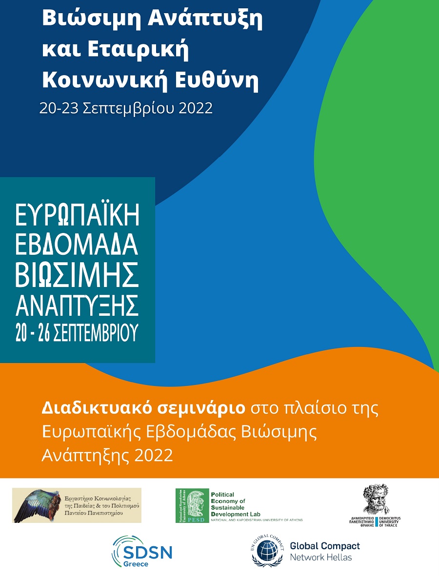 Στο πλαίσιο της Ευρωπαϊκής Εβδομάδας Βιώσιμης Ανάπτυξης 2022, το UN Global Compact Network Hellas συμπράττοντας με το UN SDSN Greece και την ακαδημαϊκή κοινότητα, συγκεκριμένα με το Εργαστήριο Κοινωνιολογίας της Παιδείας και του Πολιτισμού του Παντείου Πανεπιστημίου Κοινωνικών και Πολιτικών Επιστημών, το Εργαστήριο Πολιτικής Οικονομίας της Βιώσιμης Ανάπτυξης του Εθνικού και Καποδιστριακού Πανεπιστημίου Αθηνών και το Δημοκρίτειο Πανεπιστήμιο Θράκης, διοργανώνουν από 20 έως 23 Σεπτεμβρίου 2022 μια σειρά διαδικτυακών σεμιναρίων με θέμα τη Βιώσιμη Ανάπτυξη και την Εταιρική Κοινωνική Ευθύνη.