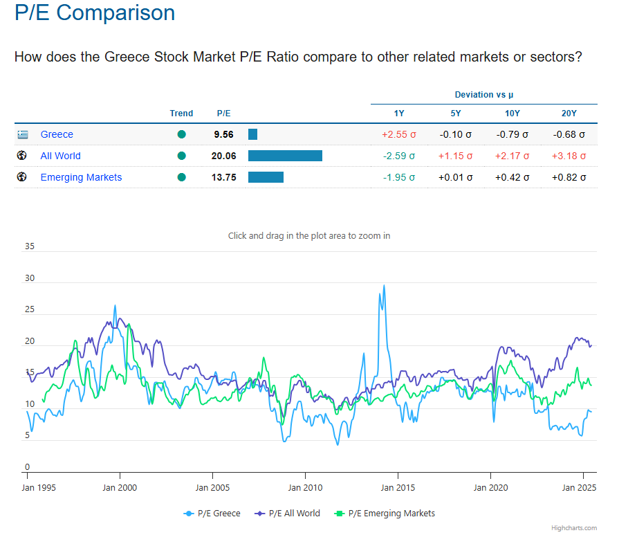 Θα παρατηρήσουμε στο παραπάνω διάγραμμα ότι η ελληνική αγορά διαπραγματεύεται με ένα discount σε ότι αφορά το συγκεκριμένο δείκτη, τόσο σε σύγκριση με τις παγκόσμιες αγορές όσο και με τις αναπτυσσόμενες.