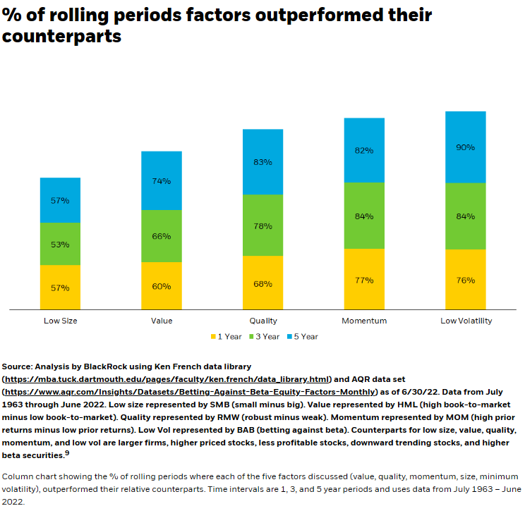 Με βάση τα τελευταία στοιχεία της Blackrock, στο παρακάτω γράφημα, φαίνεται πως σε βάθος χρόνου, ορισμένοι παράγοντες δείχνουν να υπεραποδίδουν σημαντικά της αγοράς.